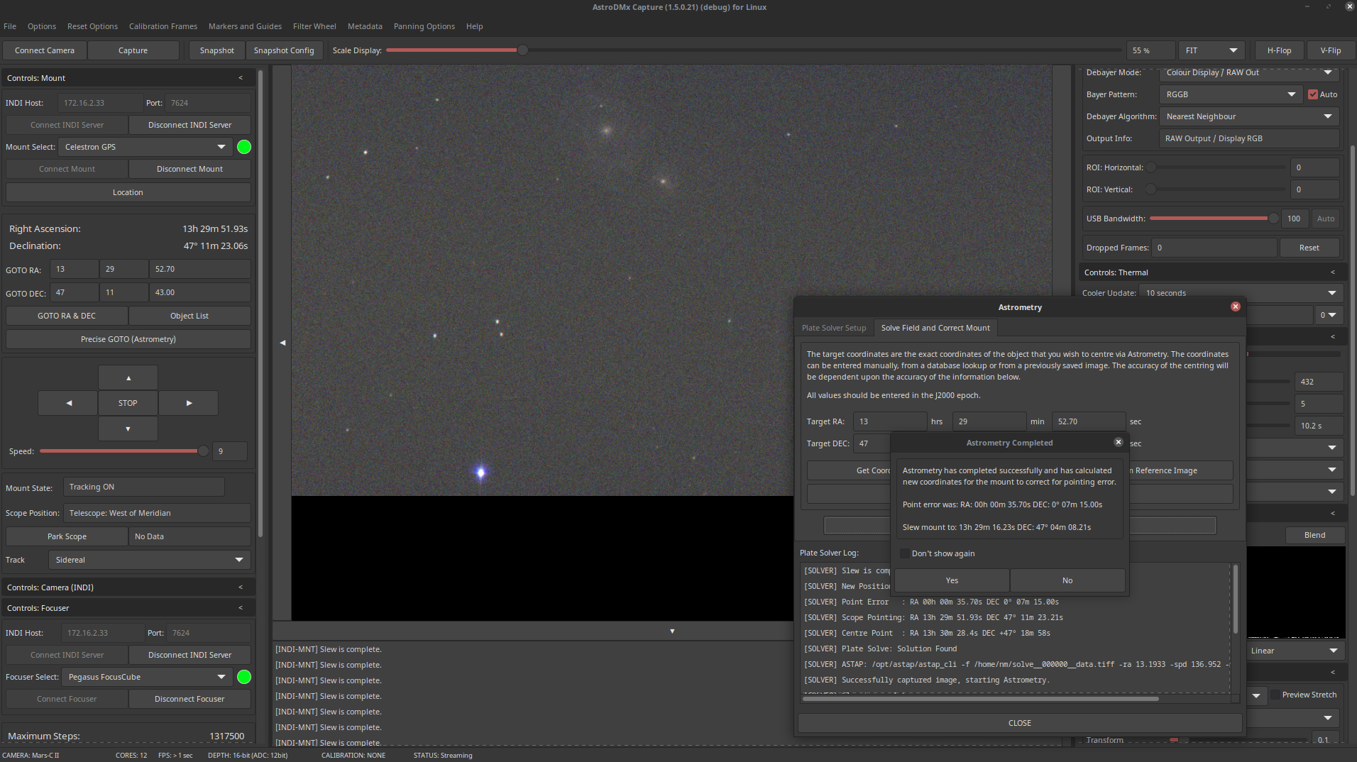 However, AstroDMx Capture can plate solve an image of the current field of view and calculate the corrections required for the mount to centre the object on the sensor.