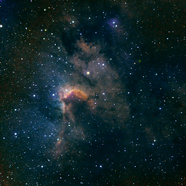 The sub-frames were calibrated, registered and stacked in Siril. The resulting stacked images were co-aligned in PixInsight (PI) to the H-alpha channel and the co-aligned imaged saved out. The co-aligned images were combined into an SHO image. The rgb composited image was cropped in Siril to remove co-alignment artefacts.
