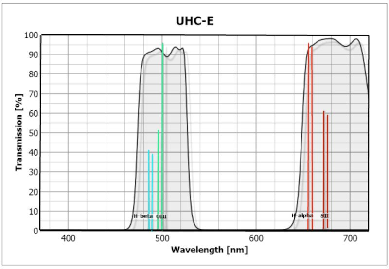 The UHC-E filter has two regions of transmission. One in the blue/green and the other in the red/far-red parts of the spectrum. It is an effective light-pollution filter and facilitates the study of emission regions.