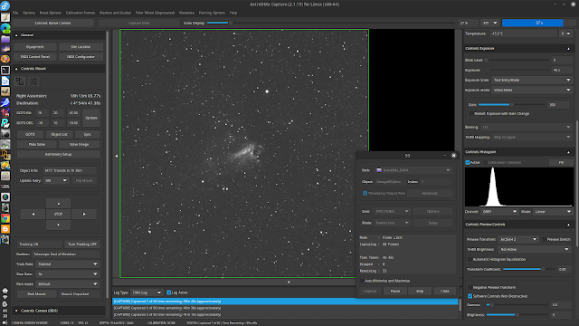 AstroDMx Capture, via the INDI server in the Raspberry Pi computer, sent the scope/mount to the Omega nebula, plate solved and centred the object.
